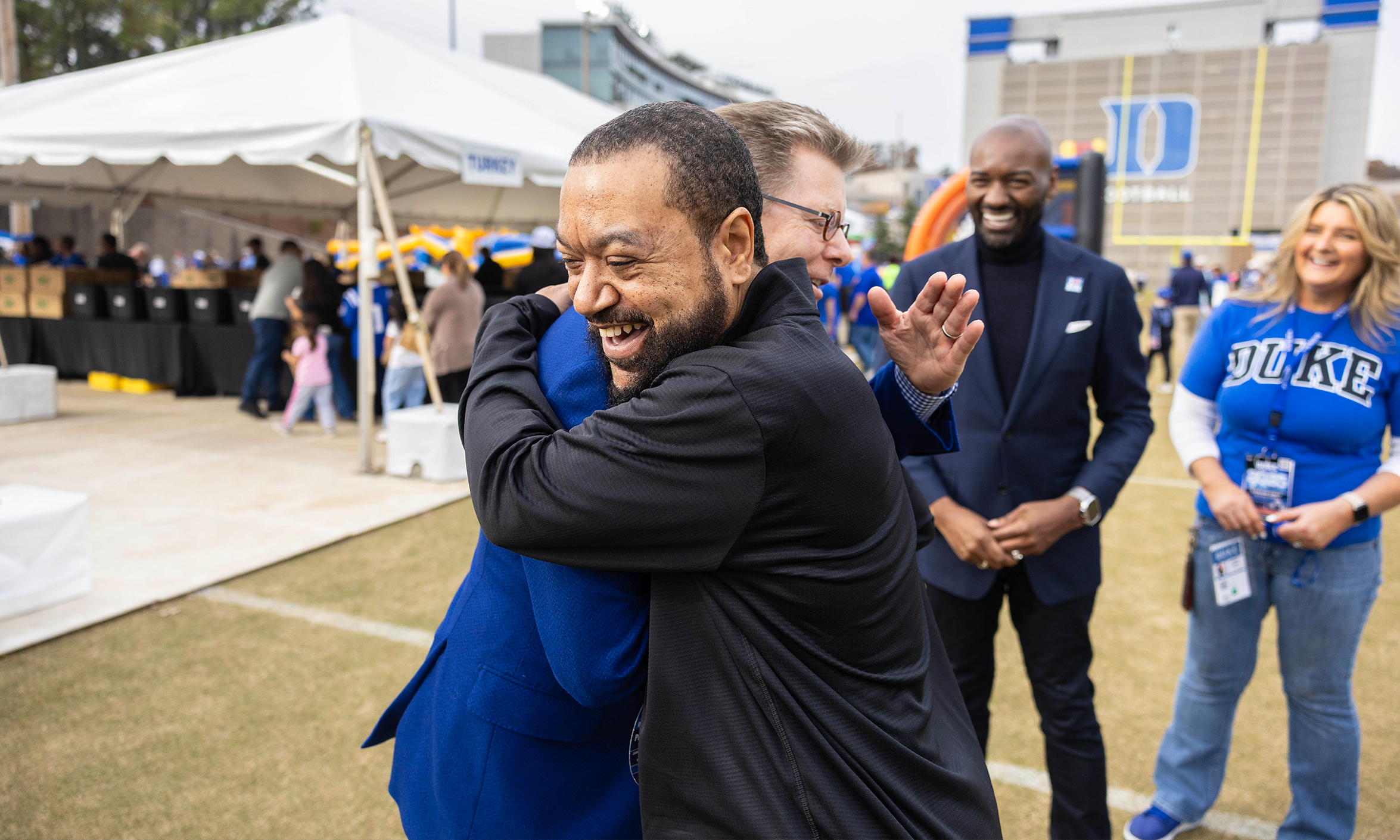Duke University President Vincent Price and Duke Football Honorary Employee Captain James Hinton Jr. embrace in front of Duke Vice President for Human Resources Antwan Lofton and Kathy Dury, Senior Program Coordinator for Duke Human Resources Staff & Family Programs.
