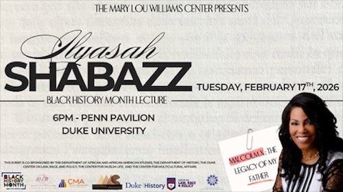 Dr. Ilyasah Shabazz, an award-winning educator, author and the daughter of Malcolm X, will share reflections on her father’s legacy and pursuits of justice, liberation and human rights at 6 p.m. at Penn Pavillion. The event is the signature event organized by Duke’s Mary Lou Williams Center for Black Culture for Black History Month.