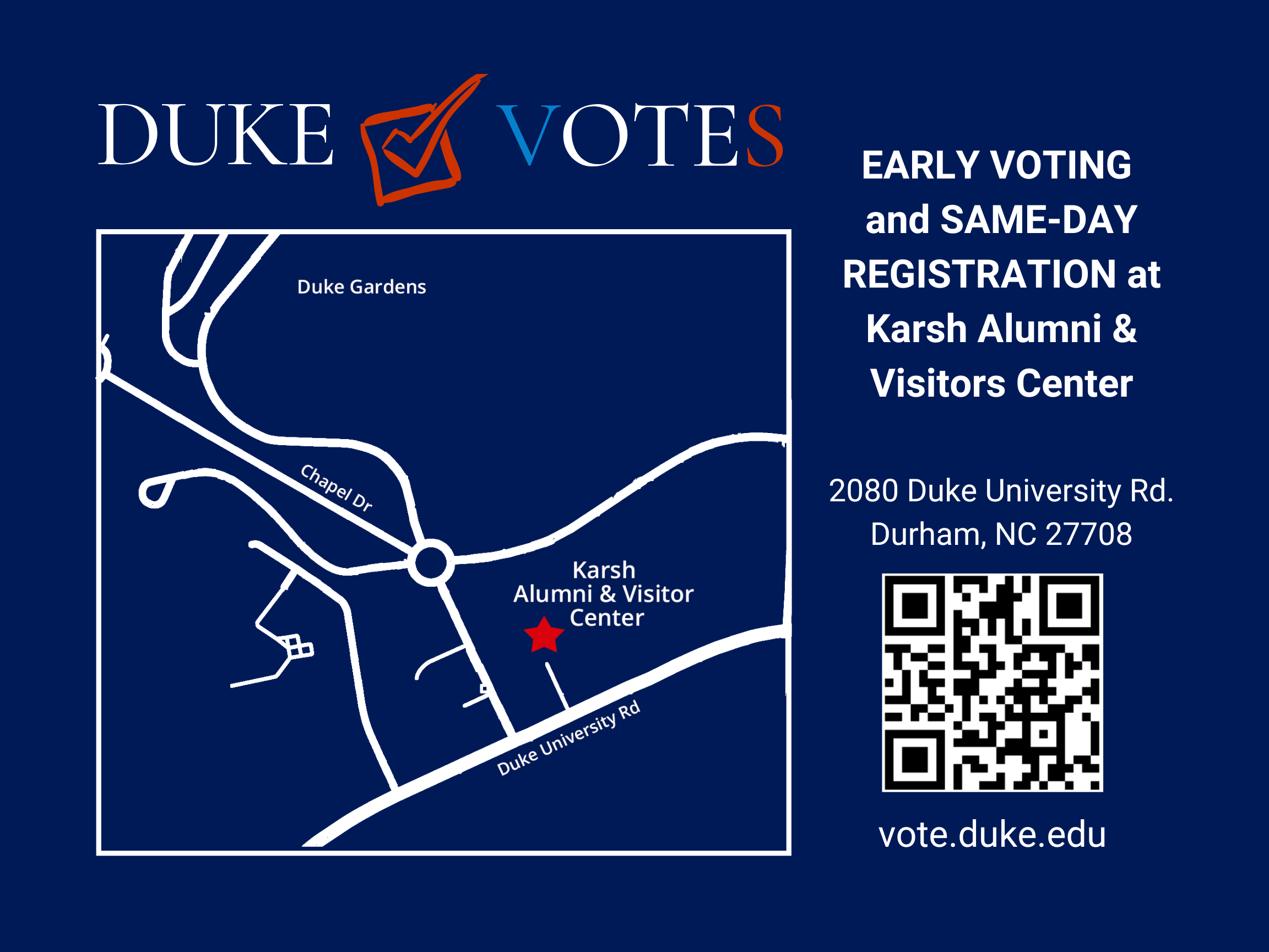 Duke University’s voting policy for employees can be found on the Duke Human Resources website. Additional information on registering to vote, voting and voter ID requirements can be found on the NC Board of Elections website or the Duke Votes website.