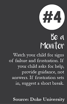 “Parents can and should be role models and mentors, but over-involvement can be a bad thing. When the teacher asks that you play a role in homework, do it. If homework is meant to be done alone, stay away. Homework is a great way for kids to develop independent, life-long learning skills. If your child asks for help, provide guidance, not answers.”