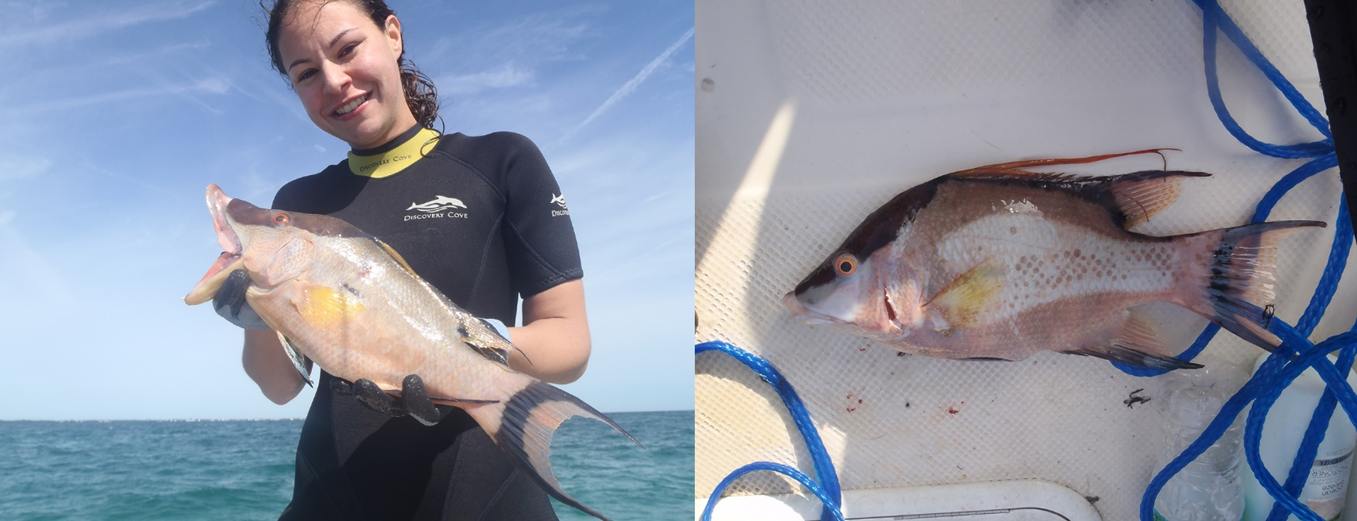 Former Duke postdoc Lori Schweikert holds a hogfish she caught while on a fishing trip in the Florida Keys.