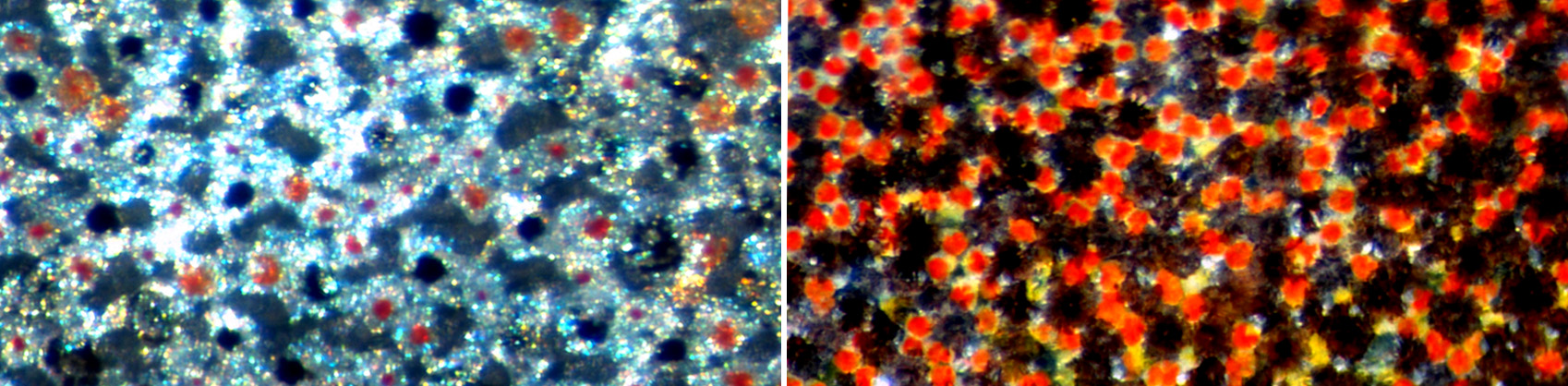 When viewed under a microscope, the pearly white (left) or reddish (right) skin of a hogfish looked like a pointillist painting.