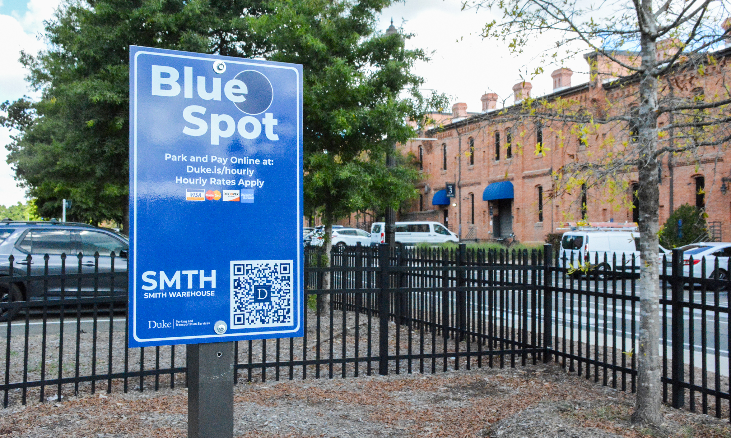When parking in one of the visitor parking lots on the University campus, users can use their mobile device to visit bluespot.duke.edu/hourly or use the QR code on nearby signs to reach the platform. After choosing their lot from the drop-down list, they can pay by entering their vehicle and payment information and how long they plan to stay. The fee is $2 per hour.