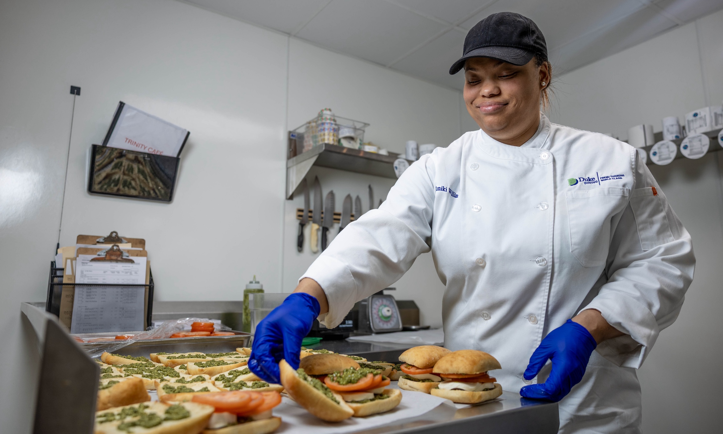 Now, at the Wall Center for Student Life on East Campus, Williamson oversees the preparation of to-go items for the Trinity Café, slicing fresh strawberries and melons for fruit cups and assembling Caesar salads and tomato, pesto and fresh mozzarella sandwiches on ciabatta rolls.